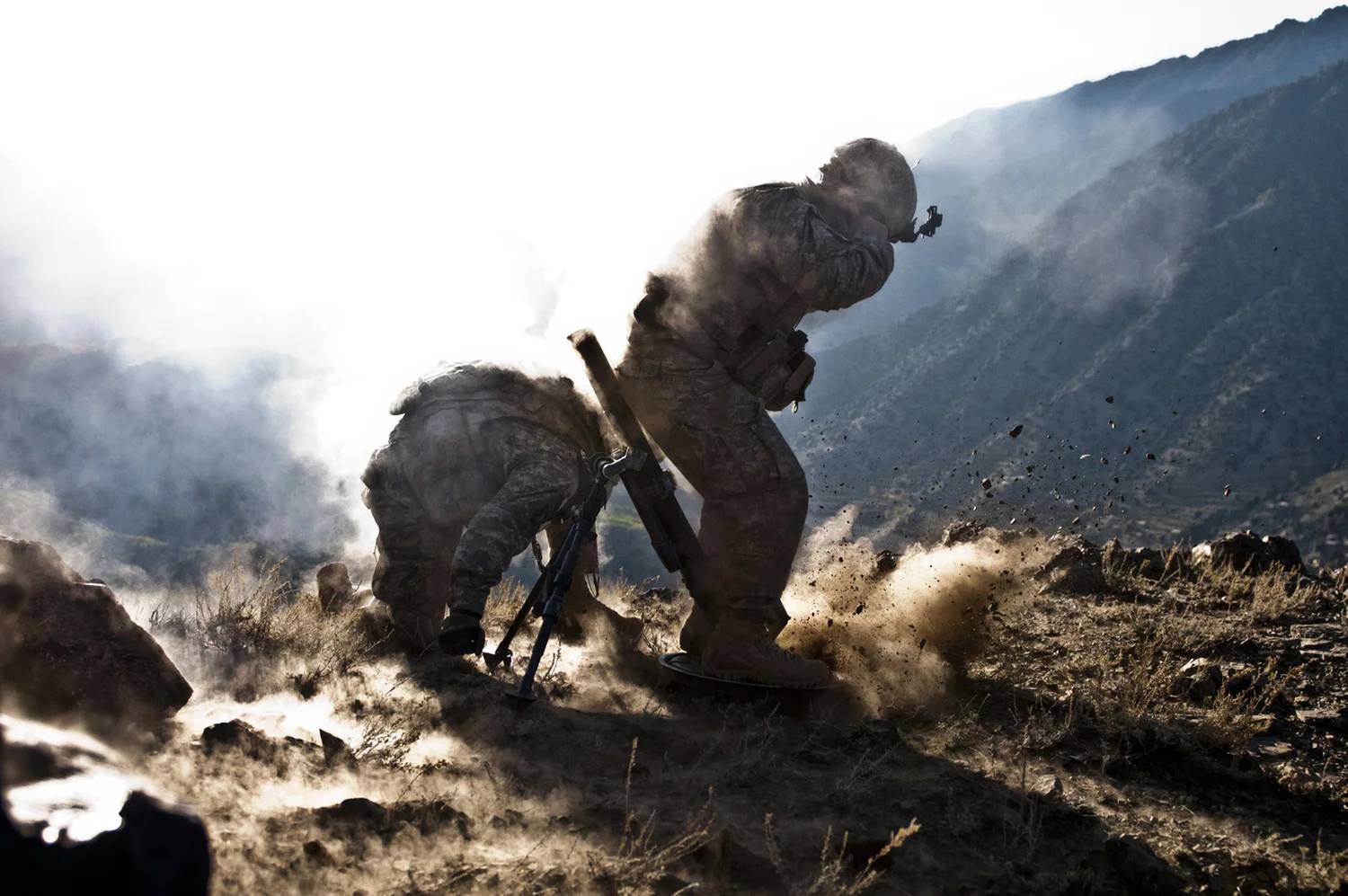 KUNAR PROVINCE, Afghanistan – A 120mm mortar round flies out of the tube as U.S. Army Staff Sgt. Ramey J. Brown (left), a section sergeant from Marshville, N.C., Spc. Tyler L. Dillon (center), a team leader from Williamstown, W. Va., and Pvt. Gabrie