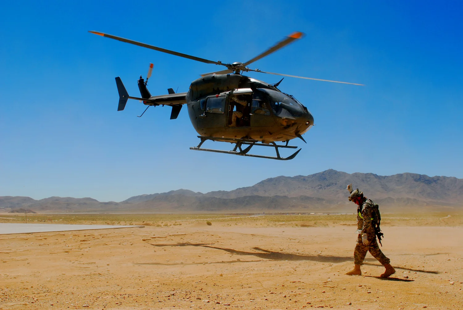 Spc. Louis R. McAnn, an air assault qualified safety from Townsend, Mass., who is a supply specialist assigned to Headquarters & Headquarters Company, 368th Engineer Battalion, directs a Kiowa resupply heliocopter at National Training Center, Fort I