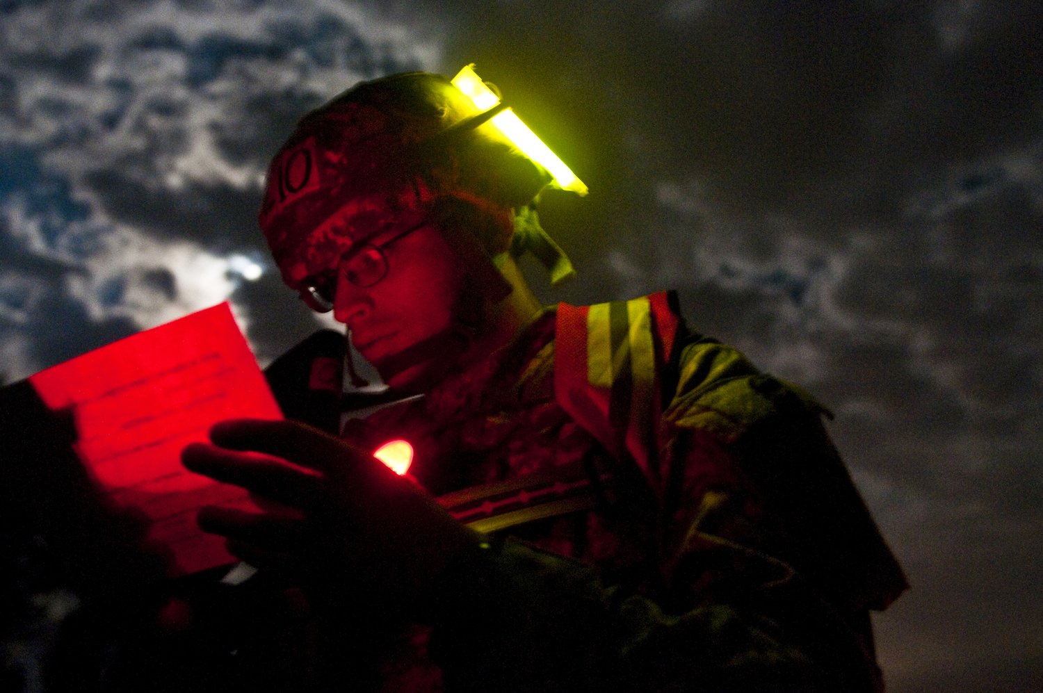 Spc. Michael Swan, a track vehicle repairer from Gurley, Ala., assigned to the 335th Signal Command,       at the night land navigation course during the 2012 U.S. Army Reserve Best Warrior Competition at Fort McCoy, Wis., July 17. The competitors s