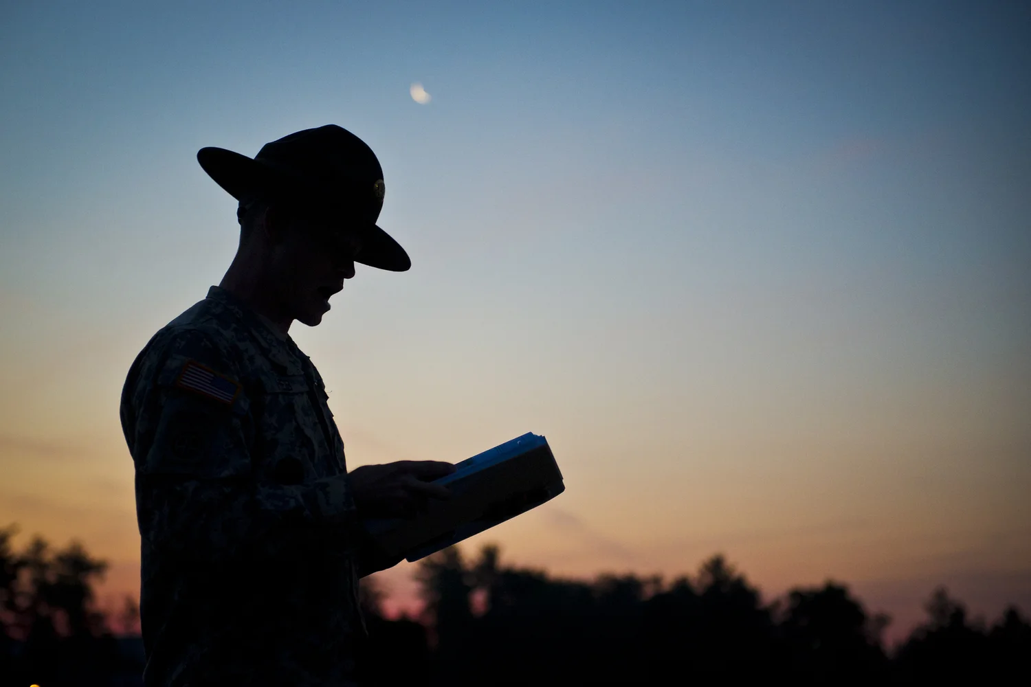 Using the moon and a red lens light, Spc. Joshua McDowell, a health care specialist and 2010 Army Reserve Best Warrior competitor from Omaha, Neb., assigned to the 7246th Instsallation Medical Support Unit, checks his grids during the land navigatio