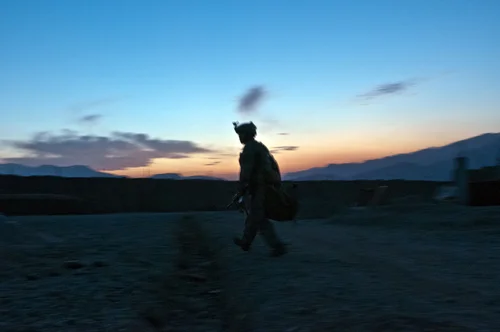 KUNAR PROVINCE, Afghanistan – As the sun sets behind U.S. Army Sgt. 1st Class Jamie R. Johnson, a platoon sergeant from Park Hills, Mo., assigned to Bayonet Company, 2nd Battalion, 327th Infantry Regiment, Task Force No Slack, he peers into the floors of the Shigal Valley in eastern Afghanistan's Kunar Province Mar. 17. No International Security Assistance Forces were injured during the joint operation where 20 insurgents were killed. (Photo by U.S. Army Sgt. 1st Class Mark Burrell, 210th MPAD)